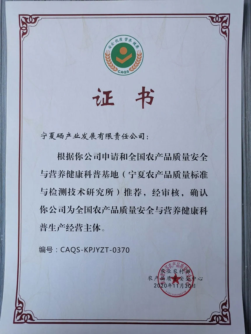 日前,由寧夏硒產(chǎn)業(yè)發(fā)展有限責(zé)任公司(以下簡稱:硒產(chǎn)業(yè)公司)獲悉,該司被農(nóng)業(yè)農(nóng)村部農(nóng)產(chǎn)品質(zhì)量安全中心確認(rèn)為:全國農(nóng)產(chǎn)品質(zhì)量安全與營養(yǎng)健康科普生產(chǎn)經(jīng)營主體!
