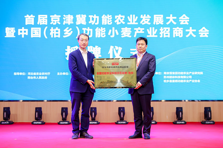 會上,國內農業科技領域專家學者為柏鄉功能農業發展把脈會診、建言獻策。蘇州硒谷科技規劃編制師張寧對《柏鄉縣富硒功能農業產業發展規劃及北方硒谷小鎮規劃》做了規劃發布與宣講。河北互動智造文化傳媒有限公司品牌總監韓旭對柏鄉縣富硒農產品區域公用品牌進行了戰略解讀。國家功能農業科技創新聯盟為柏鄉頒發了“功能農業科技示范基地”牌匾。