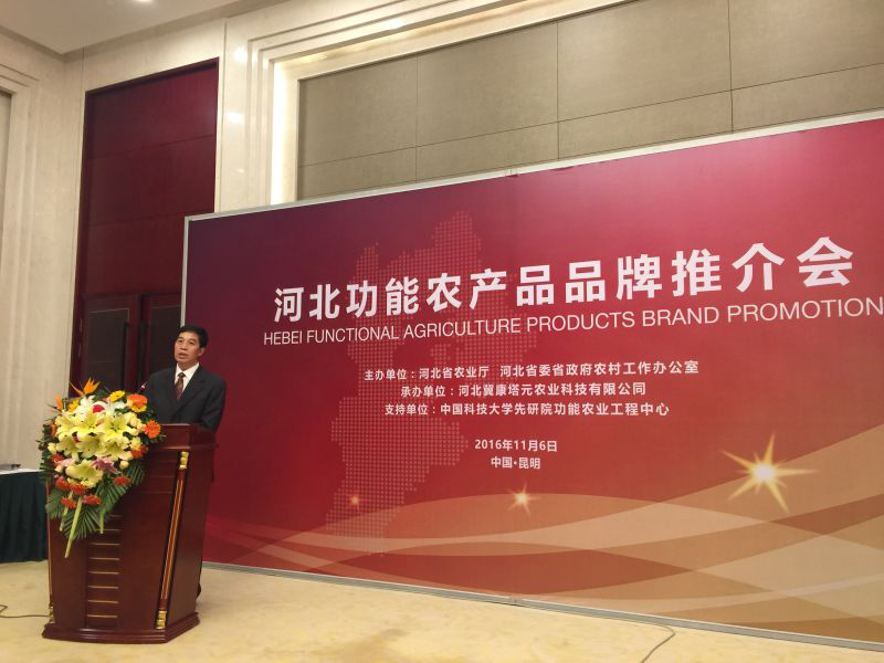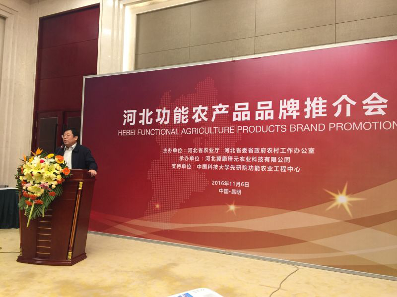 11月6日,河北省農業廳、河北省委省政府農村工作辦公室聯合在昆明國際會展中心組織舉辦了河北功能農產品品牌推介會。來自河北省農業廳相關領導、部分縣域政府、功能農業專家學者、河北功能農業產業企業代表、河北農業母艦品牌冀康等共計60人齊聚一堂,研究探討河北功能農產品及品牌發展問題。河北省農業業廳市場處王志軍處長主持會議,他說:“為了進一步提高社會各界對功能農產品的認識程度,宣傳河北功能農業企業形象,服務我國居民消費升級和‘健康中國’建設,幫助河北功能農產品打開全國市場,召開此次會議”,“河北將大力促進發展功能農業,為京津冀中高端消費市場,提供好吃、又健康的功能農產品,一方面,實踐農業供給側改革,另一方面,助力農民早日實現小康。這樣可以把原有的原料型農業,轉變提升為生態高值的效益型農業,是河北農業發展的新階段”他說。