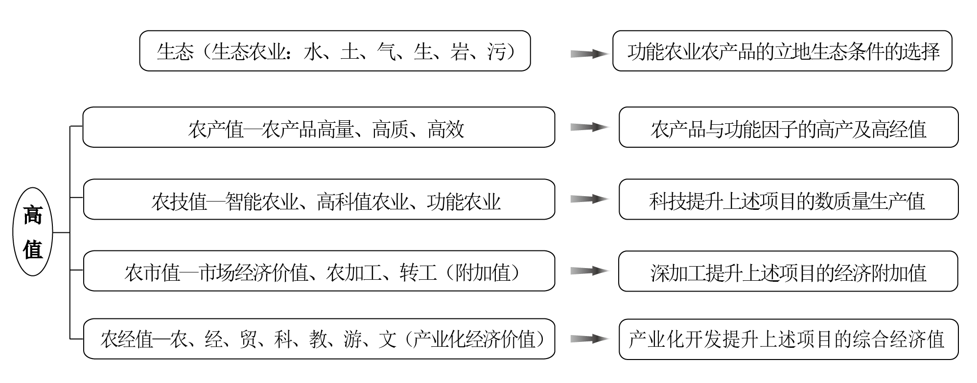 生態即指生態農業,包括水、土、氣、生、巖、污等部分。高值包括農產值、農技值、農市值、農經值。其中,農產值是指農產品高量、高質、高效,簡稱“農–產”。農技值是指功能農業、智能農業、高科值農業,簡稱“農技–產”。農市值是指市場經濟價值(農二產)、農加工、轉工,簡稱“附加值”。農經值是指產業化經濟價值(農三產),包括農、經、貿、科、教、游、文等內容,如功能農業養生園、牛博園、鹽博園、體驗農業、農業公園等。