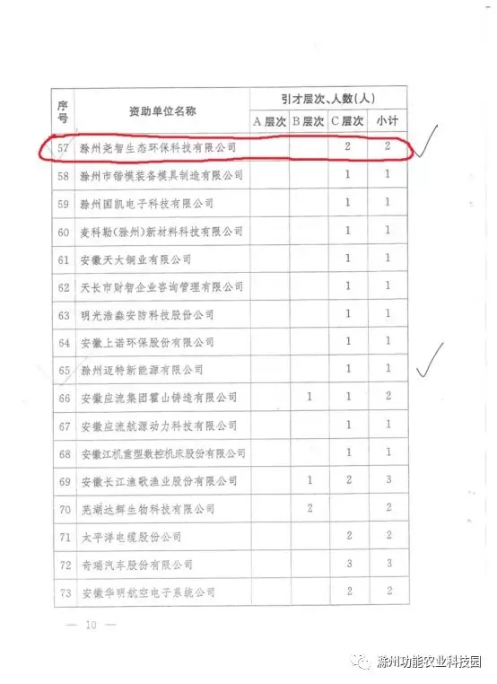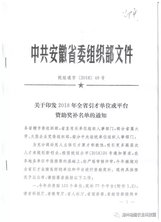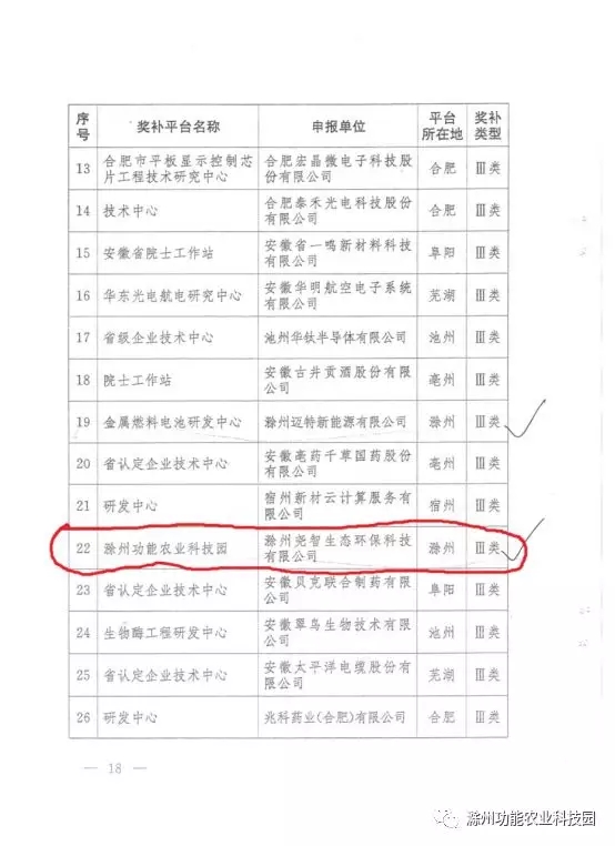 10月26日,省委組織部下發(fā)《關(guān)于印發(fā)2018年全省引才單位或平臺資助獎補名單的通知》,滁州功能農(nóng)業(yè)科技園科研平臺入圍,科技園下屬企業(yè)滁州堯智生態(tài)環(huán)保科技有限公司2位人才獲優(yōu)秀人才獎補,為滁州市企業(yè)中入圍數(shù)量和資助金額均位列首位。