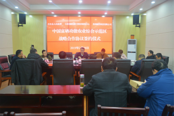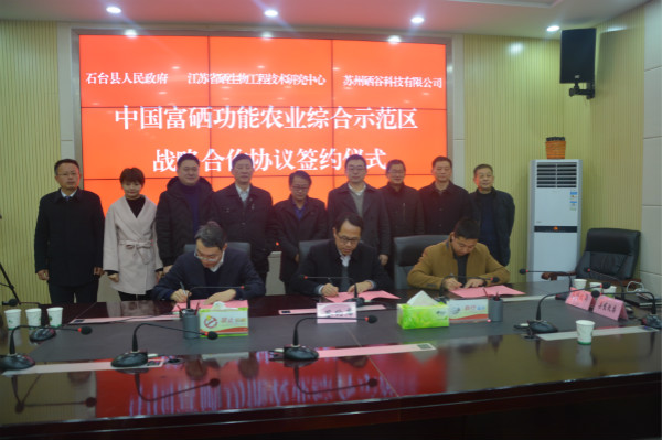 2月28日,石臺縣人民政府與江蘇省硒生物工程技術研究中心、蘇州硒谷科技有限公司共同簽訂《中國·石臺富硒功能農業綜合示范區戰略合作協議》。縣委常委、副縣長汪俊,副縣長吳亞虎、張旭, 安徽省文史館副館長張旭華 ,江蘇省硒生物工程技術研究中心主任尹雪斌、蘇州硒谷科技有限公司副總經理陸曉奇出席簽約儀式。